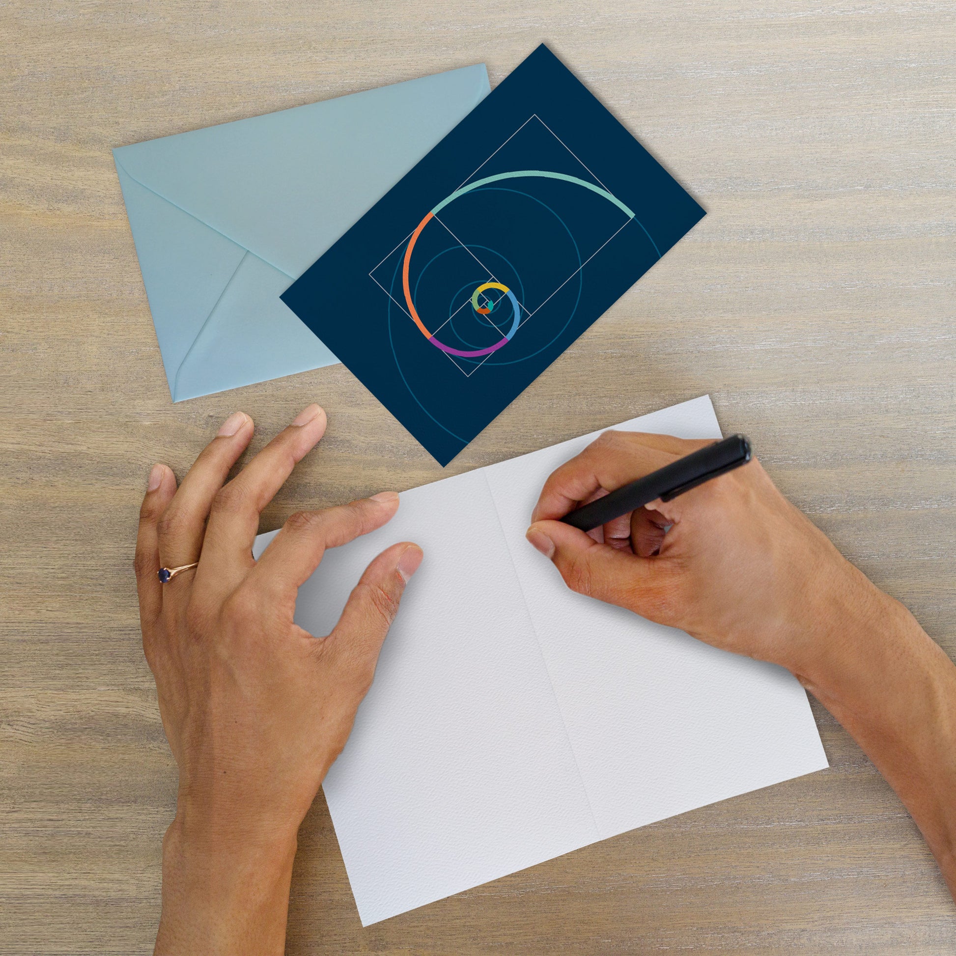 Diese Klappkarte mit der Fibonacci-Spirale eignet sich für viele Gelegenheiten. Sei es für Geburtstag, Jubiläum oder einfach als Grußkarte für verschiedenste Anlässe. Ihre Botschaft bekommt einen besonderen, außergewöhnlichen Rahmen. Der erlesene Charakter dieser Karte wird durch das Papier unterstrichen, einem hochwertigen, holzfreien 220 g Premiumkarton mit traditioneller Büttenpapier-Filzoberfläche. Die dadurch entstehende edle Papierhaptik verleiht der Karte eine zusätzliche Wertigkeit.