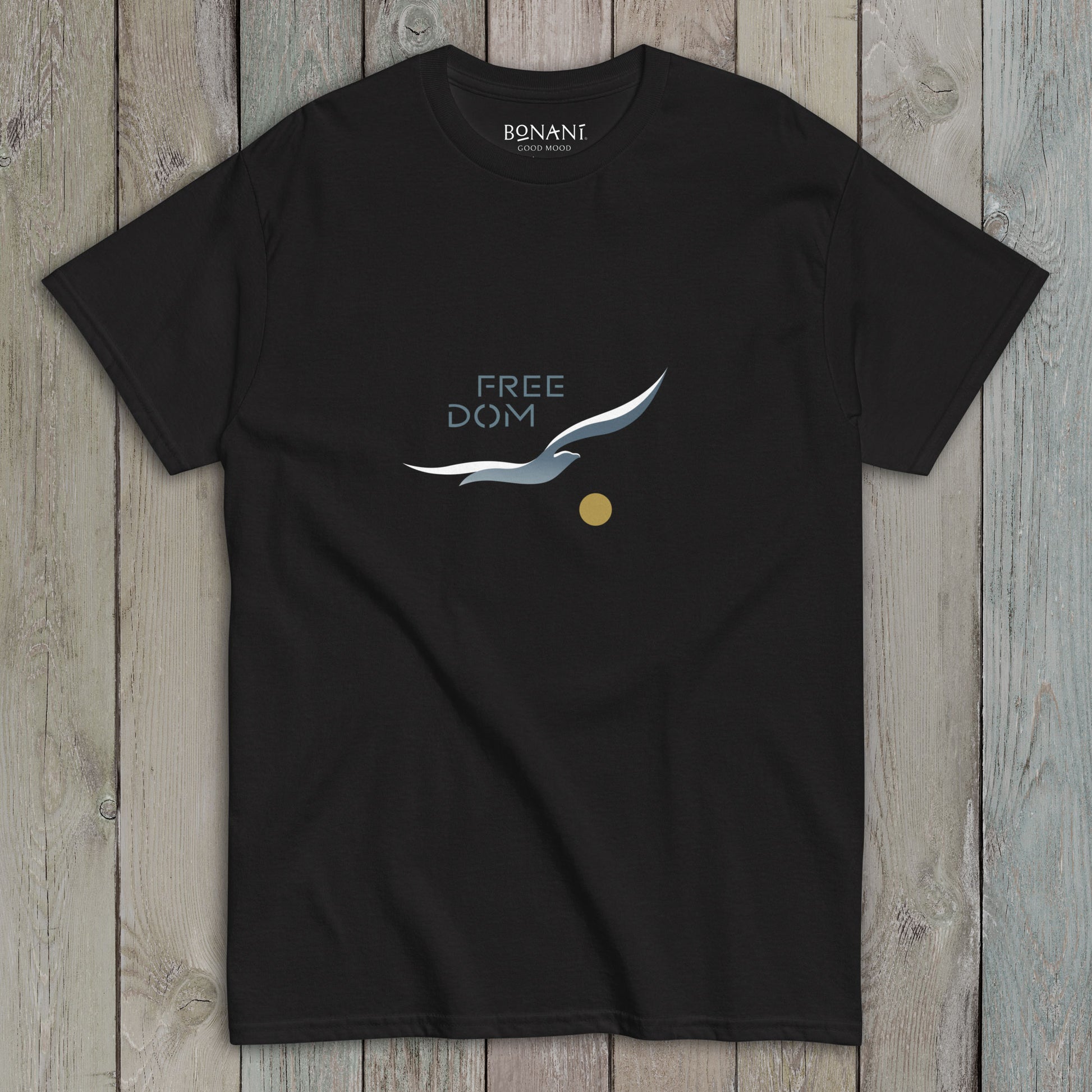 Das klassische Unisex-T-Shirt (Gildan 5000) aus 100 % Baumwolle sitzt schön, behält klare Linien an den Kanten und erinnert mit dem Design an die Freiheit des Lebens, einem Natur- und Menschenrecht